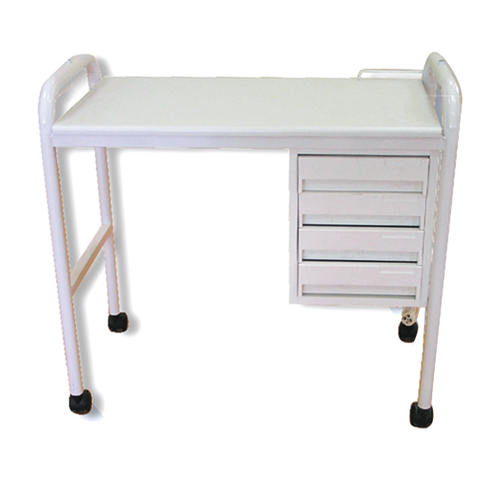 שולחן לבנייה / מניקור סטנדרטי עם גלגלים לניוד קל, משטח עבודה נוח וארבע מגירות לאיחסון.